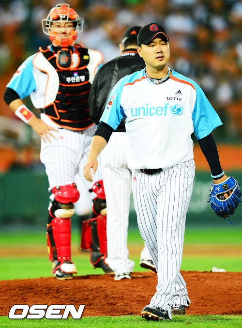 31일 오후 사직구장에서 열린 '2012 팔도 프로야구' 롯데 자이언츠와 LG 트윈스의 경기에서 9회초 무사 주자 1루 LG 이진영 타석에서 롯데 선발 송승준이 교체되고 있다.