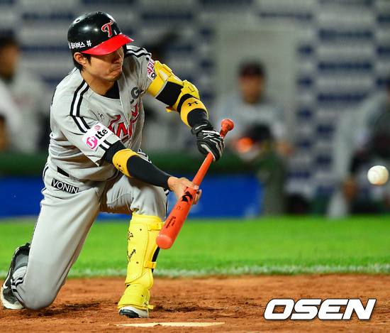 31일 오후 사직구장에서 열린 '2012 팔도 프로야구' 롯데 자이언츠와 LG 트윈스의 경기에서 9회초 무사 주자 1,2루 LG 정성훈이 희생번트에 성공하고 있다.
