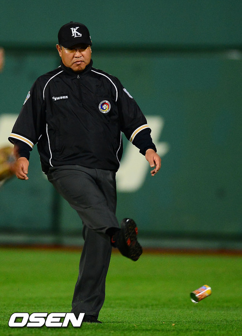 31일 오후 사직구장에서 열린 '2012 팔도 프로야구' 롯데 자이언츠와 LG 트윈스의 경기에서 9회초1사 주자 만루 서동욱의 2루수 앞 땅볼때 홈에서 이병규를 포스아웃 시킨후 1루로 송구한 롯데의 병살 플레이에서 1루에서 서동욱이 세이프되자 롯데 팬들이 쓰레기를 투척, 오석환 1루심이 쓰레기를 경기장 밖으로 차내고 있다.