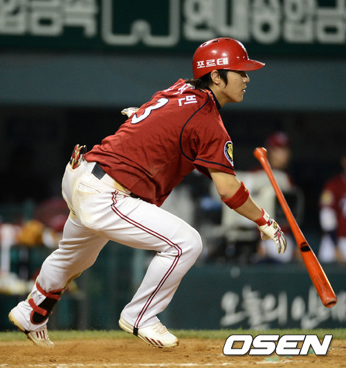 31일 오후 서울 잠실야구장에서 열린 '2012 팔도 프로야구' 두산 베어스와 KIA 타이거즈의 경기, 8회초 무사 KIA 김선빈이 중전 안타를 날리고 있다.