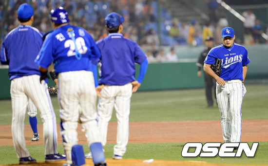 31일 오후 대전 한밭구장에서 열린 '2012 팔도 프로야구' 한화 이글스와 삼성 라이온즈의 경기 8회말 교체된 오승환이 마운드에 오르고 있다.