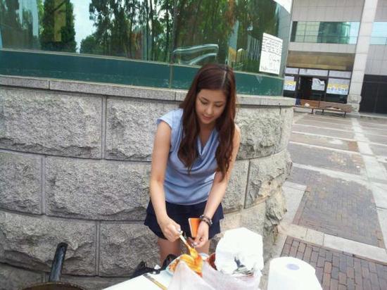 가수 솔비가 대학교 축제에서 떡꼬치를 먹고 있는 소탈한 일상 사진을 공개했다.