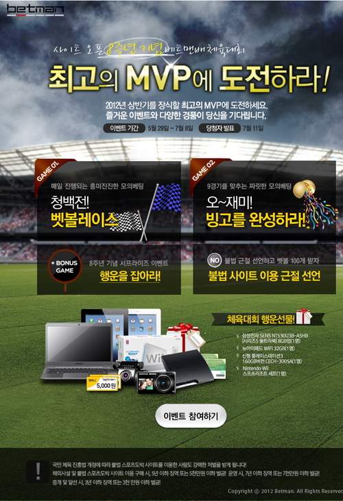 스포츠토토의 공식 온라인 발매 사이트 베트맨이 사이트 오픈 8주념을 기념하여 베트맨체육대회 최고의 MVP에 도전하라! 이벤트를 오는 7월 8일까지 실시한다.
