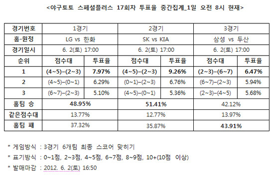 2012 프로야구 주말 3경기 대상 야구토토 스페셜플러스 17회차 투표율 중간집계