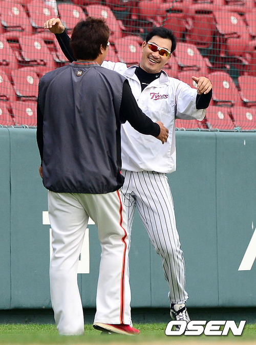 1일 오후 서울 잠실구장에서 열린 '2012 팔도 프로야구' LG 트윈스와 한화 이글스의 경기, 경기전 한화 류현진과 LG 봉중근이 반갑게 인사를 나누고 있다.