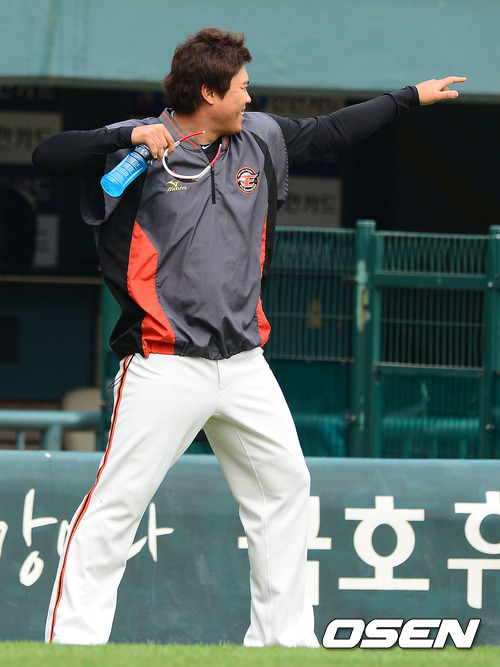 1일 오후 서울 잠실구장에서 열린 '2012 팔도 프로야구' LG 트윈스와 한화 이글스의 경기, 경기전 한화 류현진이 그라운드에서 러닝중인 LG 봉중근을 발견하고 반갑게 인사를 건네고 있다.