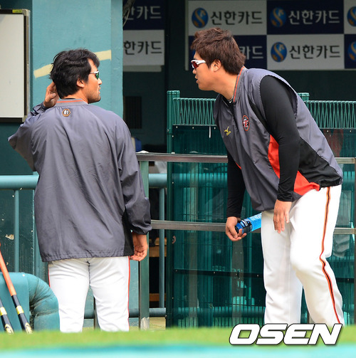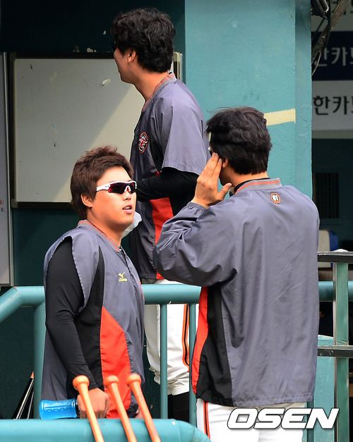 1일 오후 서울 잠실구장에서 열린 '2012 팔도 프로야구' LG 트윈스와 한화 이글스의 경기, 경기전 한화 류현진이 박찬호의 머리 스타일을 유심히 살펴보고 있다.