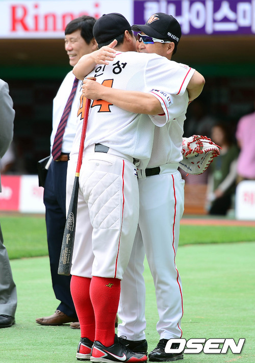1일 오후 인천 문학구장에서 열리는 '2012 팔도 프로야구' SK 와이번스와 KIA 타이거즈의 경기 시작전 훈련에서 이만수 감독이 조인성과 포옹을 나누고 있다.