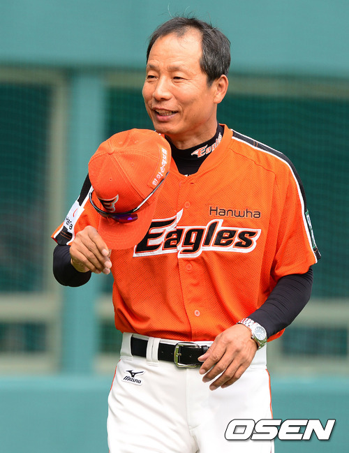 1일 오후 서울 잠실구장에서 열린 '2012 팔도 프로야구' LG 트윈스와 한화 이글스의 경기, 경기전 한화 김용달 타격코치가 LG 코칭스태프와 인사를 하고 있다.