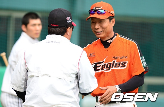 1일 오후 서울 잠실구장에서 열린 '2012 팔도 프로야구' LG 트윈스와 한화 이글스의 경기, 경기전 한화 김용달 타격코치가 LG 김무관 타격 코치와 인사를 나누고 있다. 김용달 코치는 LG 타격코치를 역임했었다.