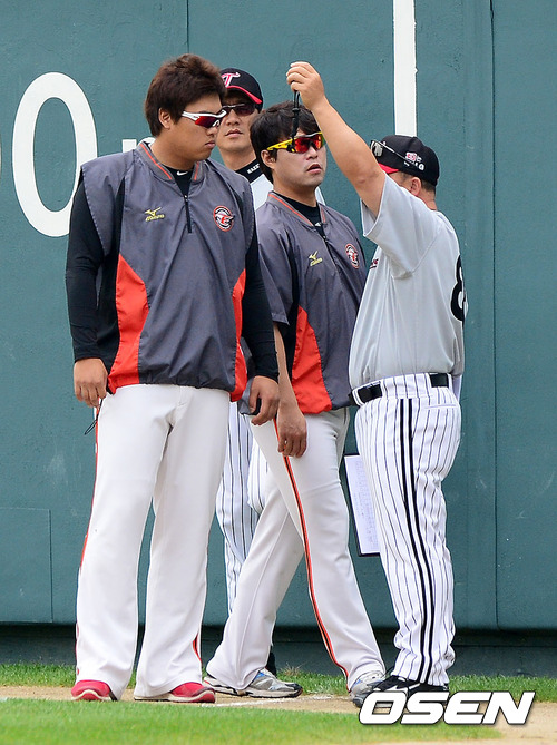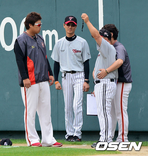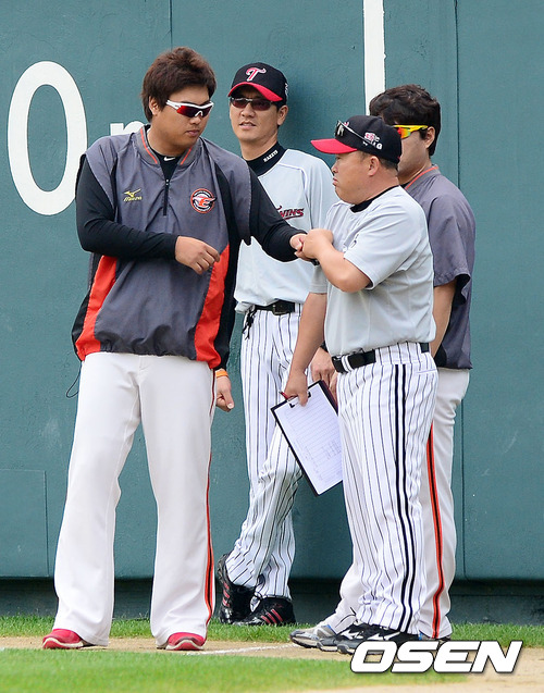 1일 오후 서울 잠실구장에서 열린 '2012 팔도 프로야구' LG 트윈스와 한화 이글스의 경기, 경기전 한화 류현진 송신영이 LG 김용일 코치와 인사를 나누고 있다.