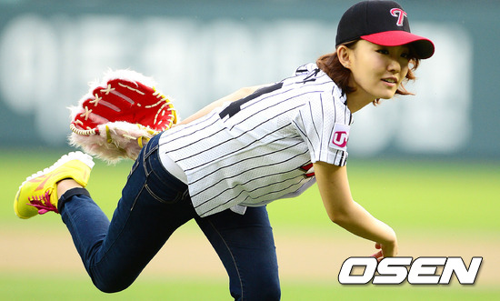 1일 오후 서울 잠실구장에서 열린 '2012 팔도 프로야구' LG 트윈스와 한화 이글스의 경기, 경기전 가수 윤하가 시구를 하고 있다.