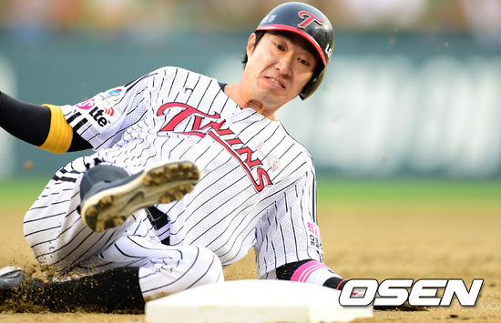 1일 오후 서울 잠실구장에서 열린 '2012 팔도 프로야구' LG 트윈스와 한화 이글스의 경기, 1회말 2사 1,2루에서 LG 이진영의 동점 적시타에 1루 주자 정성훈이 3루에서 슬라이딩하며 세이프되고 있다.