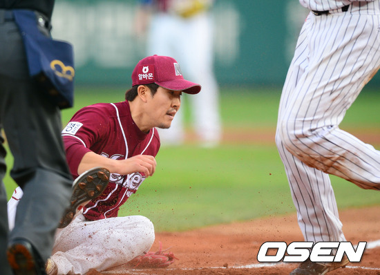 1일 오후 사직구장에서 열린 '2012 팔도 프로야구' 롯데 자이언츠와 넥센 히어로즈의 경기에서 1회말 1사 1, 2루에서 넥센 선발 김병현의 폭투때 2루주자 김주찬이 홈까지 파고들어 선취득점을 올리며 홈에서 태그를 시도했던 김병현이 볼을 빠트리며 넘어지고 있다.