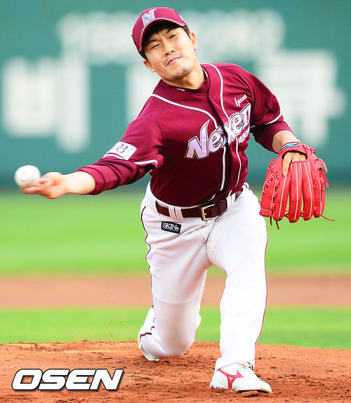 1일 오후 사직구장에서 열린 '2012 팔도 프로야구' 롯데 자이언츠와 넥센 히어로즈의 경기에서 넥센 선발 김병현이 힘차게 공을 뿌리고 있다.
