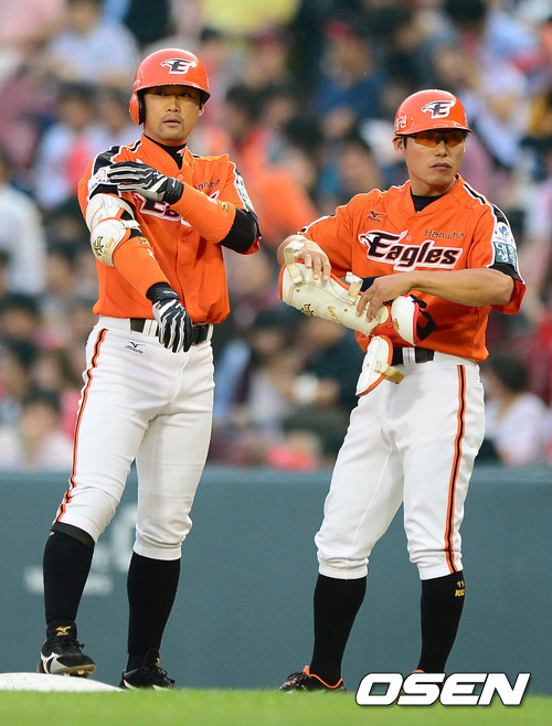 1일 오후 서울 잠실구장에서 열린 '2012 팔도 프로야구' LG 트윈스와 한화 이글스의 경기, 2회초 1사 1,2루에서 한화 강동우가 1타점 적시타를 날리고 최만호 코치와 이야기를 나누고 있다.