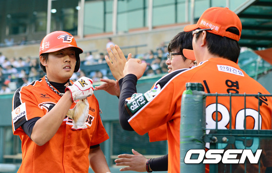 1일 오후 서울 잠실구장에서 열린 '2012 팔도 프로야구' LG 트윈스와 한화 이글스의 경기, 2회초 1사 1,2루에서 한화 강동우의 1타점 적시타에 홈을 밟은 오선진이 더그아웃에서 동료선수들의 축하를 받고 있다.