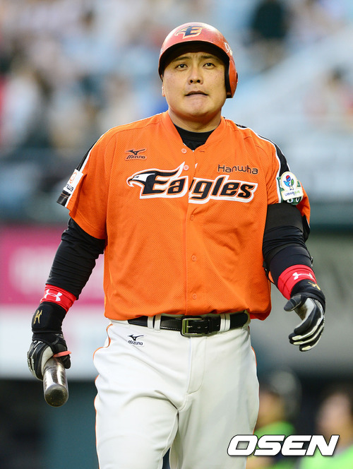 1일 오후 서울 잠실구장에서 열린 '2012 팔도 프로야구' LG 트윈스와 한화 이글스의 경기, 2회초 2사 1,3루에서 한화 김태균이 삼진으로 물러나며 아쉬워하고 있다.