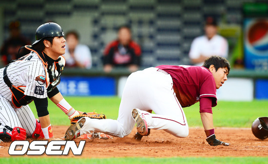 1일 오후 사직구장에서 열린 '2012 팔도 프로야구' 롯데 자이언츠와 넥센 히어로즈의 경기에서 2회초 1사 2, 3루 넥센 오윤의 우전 2타점 동점 적시타때 2루주자 강정호가 홈까지 파고들어 2-2를 만드는 동점 득점을 올린 후 구심을 바라보고 있다.