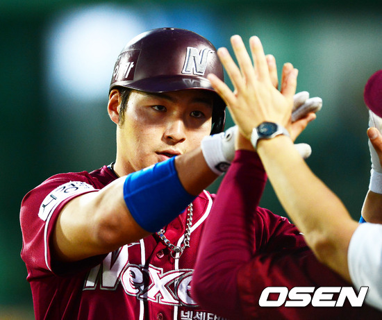 1일 오후 사직구장에서 열린 '2012 팔도 프로야구' 롯데 자이언츠와 넥센 히어로즈의 경기에서 4회초 첫타석에서 넥센 박병호가 좌월 솔로 홈런을 날린 후 덕아웃에서 동료들과 하이파이브를 하고 있다.