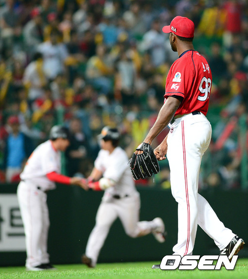 1일 오후 인천 문학구장에서 열린 '2012 팔도 프로야구' SK 와이번스와 KIA 타이거즈의 경기 6회말 선두타자 정근우에게 솔로포를 내준 소사가 정근우를 바라보고 있다.