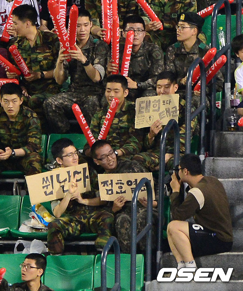 1일 오후 서울 잠실구장에서 열린 '2012 팔도 프로야구' LG 트윈스와 한화 이글스의 경기, 국군장병들이 외야석에 자리잡고 경기를 관전하고 있다.