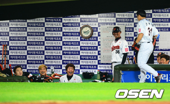 1일 오후 사직구장에서 열린 '2012 팔도 프로야구' 롯데 자이언츠와 넥센 히어로즈의 경기에서 4회말 2사 주자없는 상황에서 롯데 손아섭이 중월 솔로 홈런을 날린 후 덕아웃으로 들어왔으나 선수들이 덕아웃에 가만히 앉아 있자 손아섭이 의아해하고 있다.