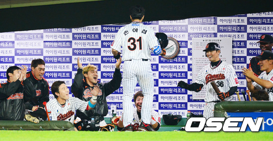 1일 오후 사직구장에서 열린 '2012 팔도 프로야구' 롯데 자이언츠와 넥센 히어로즈의 경기에서 4회말 2사 주자없는 상황에서 롯데 손아섭이 중월 솔로 홈런을 날린 후 덕아웃으로 들어왔으나 선수들이 덕아웃에 가만히 앉아 있다가 갑자기 자리에서 일어나며 손아섭을 반기고 있다.