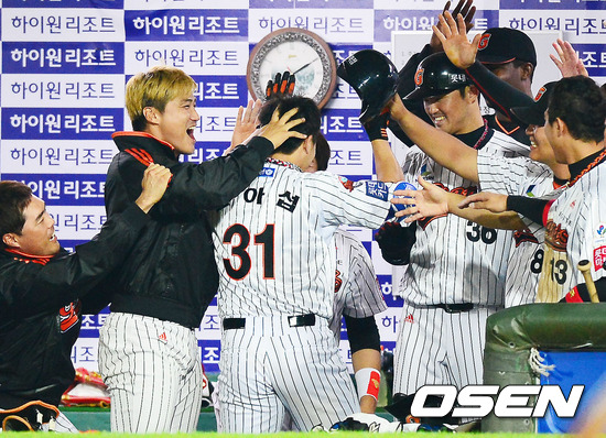1일 오후 사직구장에서 열린 '2012 팔도 프로야구' 롯데 자이언츠와 넥센 히어로즈의 경기에서 4회말 2사 주자없는 상황에서 롯데 손아섭이 중월 솔로 홈런을 날린 후 덕아웃으로 들어왔으나 선수들이 덕아웃에 가만히 앉아 있다가 갑자기 자리에서 일어나며 손아섭을 반기고 있다.