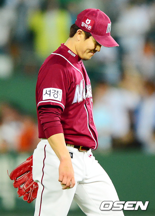 1일 오후 사직구장에서 열린 '2012 팔도 프로야구' 롯데 자이언츠와 넥센 히어로즈의 경기에서 4회말 2사 주자없는 상황에서 롯데 손아섭이 중월 솔로 홈런을 맞은 넥센 선발 김병현이 고개를 숙이고 있다.