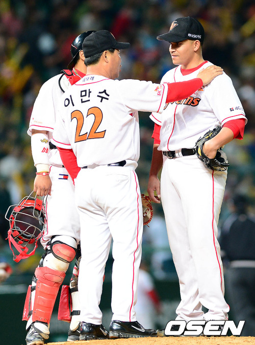 1일 오후 인천 문학구장에서 열린 '2012 팔도 프로야구' SK 와이번스와 KIA 타이거즈의 경기 8회초 1사 이만수 감독이 마리오를 격려하고 있다. 마리오는 박희수로 교체.
