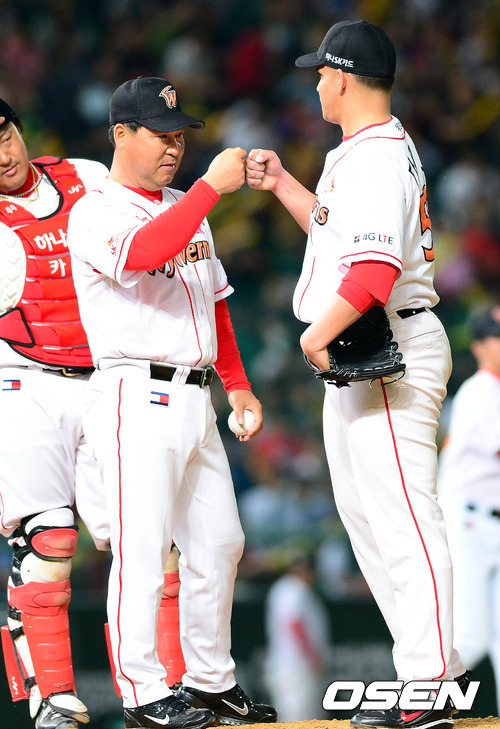 1일 오후 인천 문학구장에서 열린 '2012 팔도 프로야구' SK 와이번스와 KIA 타이거즈의 경기 8회초 1사 이만수 감독이 마리오를 격려하고 있다. 마리오는 박희수로 교체.