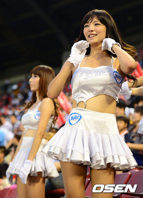 1일 오후 서울 잠실구장에서 열린 '2012 팔도 프로야구' LG 트윈스와 한화 이글스의 경기, LG 치어리더 강윤이가 응원도중 미소짓고 있다.