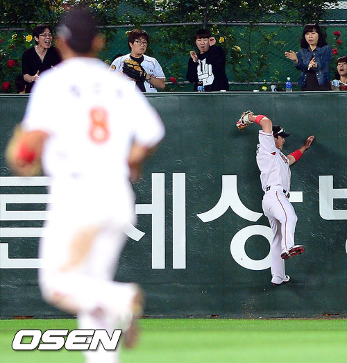 1일 오후 인천 문학구장에서 열린 '2012 팔도 프로야구' SK 와이번스와 KIA 타이거즈의 경기 9회초 선두타자 김선빈의 타구를 좌익수 박재상이 잡고 있다.