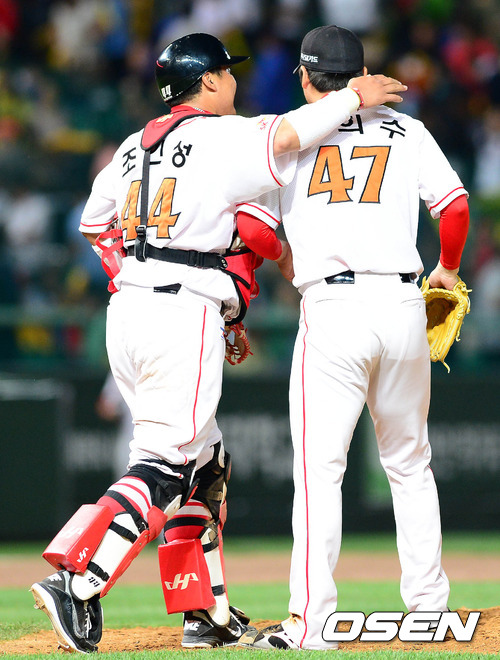 1일 오후 인천 문학구장에서 열린 '2012 팔도 프로야구' SK 와이번스와 KIA 타이거즈의 경기 종료후 조인성과 박희수가 서로를 격려하고 있다.
