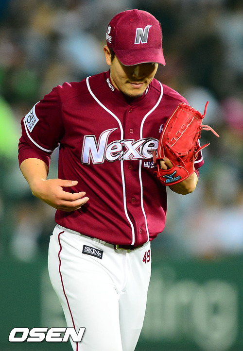 1일 오후 사직구장에서 열린 '2012 팔도 프로야구' 롯데 자이언츠와 넥센 히어로즈의 경기에서 4회말 2사 주자 2루 롯데 박종윤 타석에서 넥센 선발 김병현이 고개를 숙인채 강판당하고 있다.