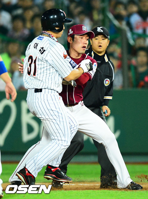 1일 오후 사직구장에서 열린 '2012 팔도 프로야구' 롯데 자이언츠와 넥센 히어로즈의 경기에서 6회말 1사 주자 1루 전준우의 병살타때 1루 주자 손아섭이 1루와 2루 사이에서 넥센 2루수 서건창에게 협상을 당하고 있다.