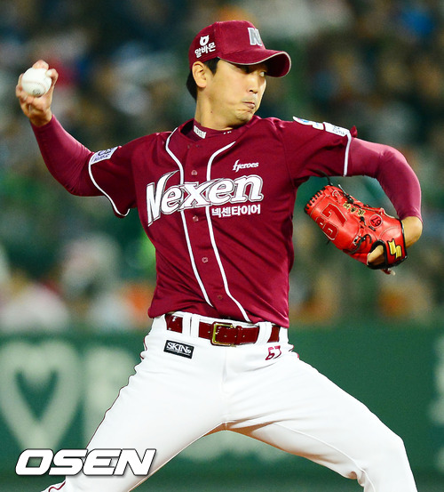 1일 오후 사직구장에서 열린 '2012 팔도 프로야구' 롯데 자이언츠와 넥센 히어로즈의 경기에서 4회말 2사 주자 2루 롯데 박종윤 타석에서 넥센 선발 김병현 대신 마운드에 오른 넥센 심수창이 힘차게 공을 뿌리고 있다.
