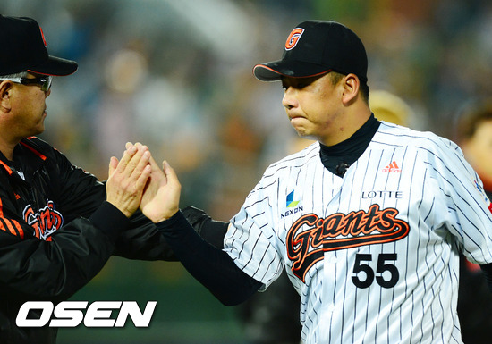 경기를 마치고 롯데 김사율이 양승호 감독과 하이파이브를 하고 있다. / rumi@osen.co.kr