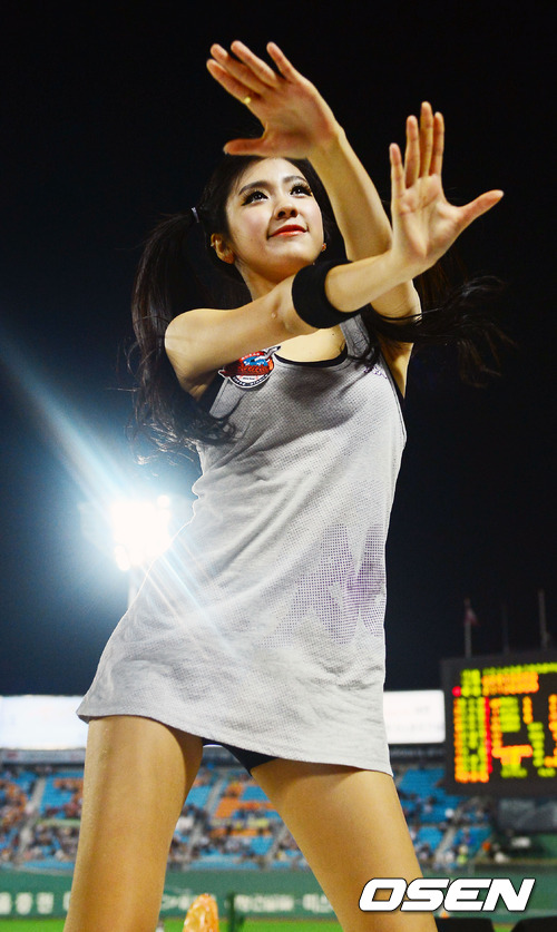 롯데 치어리더 김연정이 아이유 '너랑나' 음악에 맞춰서 깜찍한 안무를 선보이고 있다. / rumi@osen.co.kr