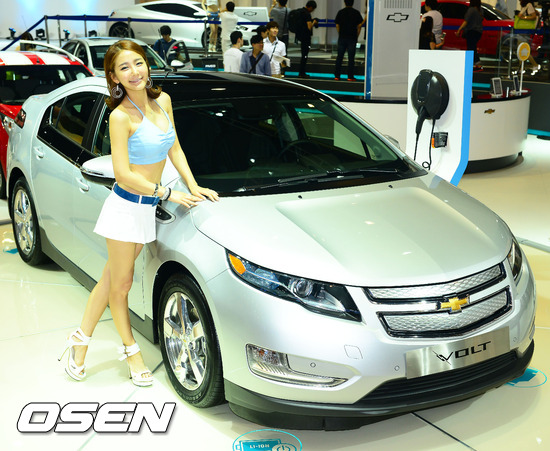 1일 '2012 부산국제모터쇼(BIMOS)'에서 레이싱 모델 방은영이 하이브리드 전기차 쉐보레 볼트 옆에서 포즈를 취하고 있다.