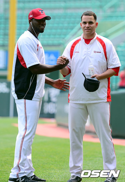 2일 오후 인천 문학구장에서 열리는 '2012 팔도 프로야구' SK 와이번스와 KIA 타이거즈의 경기 시작전 소사와 마리오가 악수를 하며 인사를 나누고 있다.