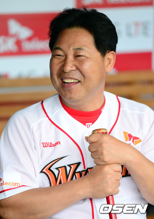 2일 오후 인천 문학구장에서 열리는 '2012 팔도 프로야구' SK 와이번스와 KIA 타이거즈의 경기 시작전 이만수 감독이 취재진들과 이야기를 나누고 있다.