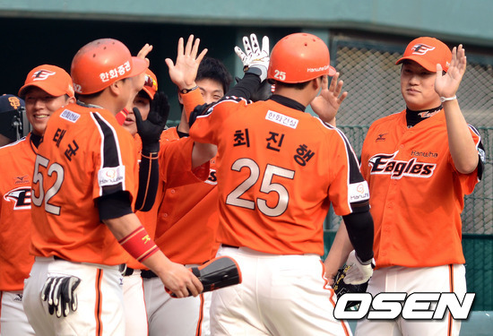 2일 오후 서울 잠실구장에서 열린 '2012 팔도 프로야구' LG 트윈스와 한화 이글스의 경기, 1회초 2사 1,2루 한화 최진행이 3점 홈런을 치고 덕아웃에서 양훈과 하이파이브를 하고 있다.
