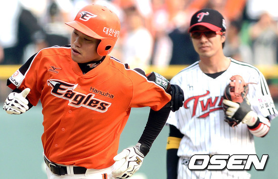 2일 오후 서울 잠실구장에서 열린 '2012 팔도 프로야구' LG 트윈스와 한화 이글스의 경기, 1회초 2사 1,2루 한화 최진행이 3점 홈런을 치고 베이스를 돌고 있다. LG 정성훈이 씁쓸한 표정으로 최진행을 바라보고 있다.