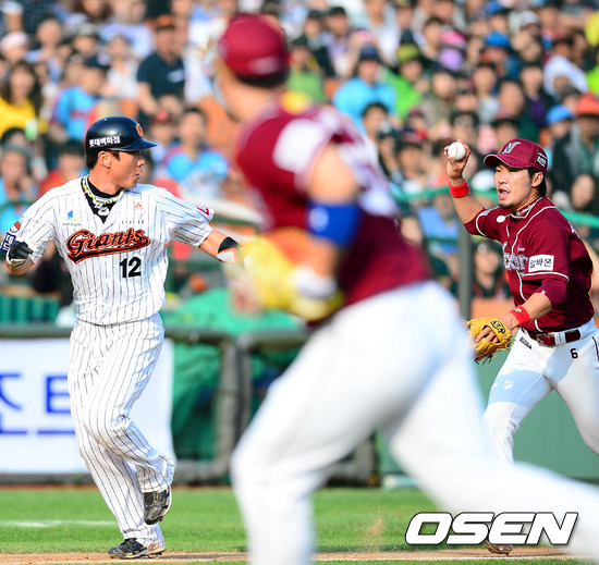 2일 오후 사직구장에서 열린 '2012 팔도 프로야구' 롯데 자이언츠와 넥센 히어로즈의 경기에서 1회말 무사 주자 1, 3루 롯데 손아섭 3루수 앞 땅볼때 3루 주자 김주찬이 3루와 홈사이에서 협살을 피하려 하고 있다.