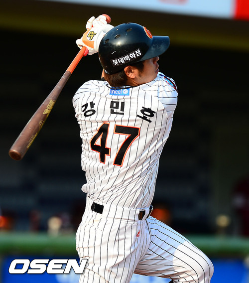 2일 오후 사직구장에서 열린 '2012 팔도 프로야구' 롯데 자이언츠와 넥센 히어로즈의 경기에서 1회말 2사 주자 만루 롯데 강민호가 좌중월 만루 홈런을 날리고 있다.