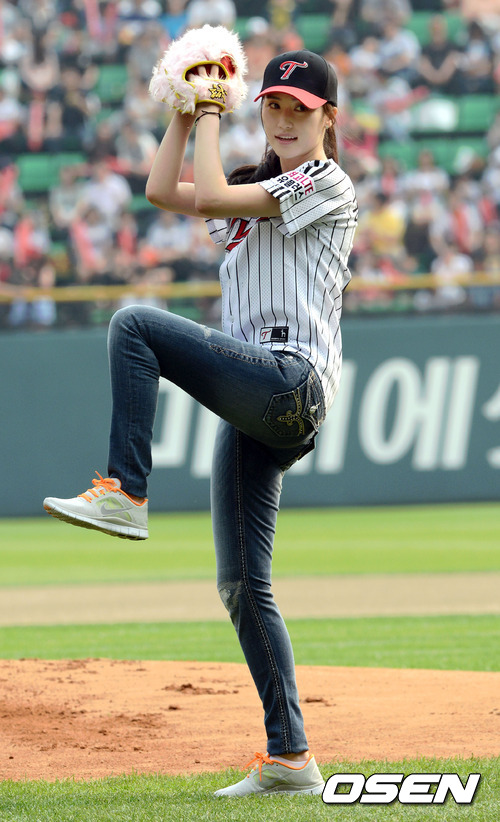 2일 오후 서울 잠실구장에서 열린 '2012 팔도 프로야구' LG 트윈스와 한화 이글스의 경기에 배우 공현주가 멋진 폼으로 시구를 하고 있다.