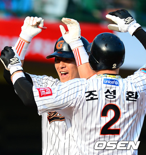 2일 오후 사직구장에서 열린 '2012 팔도 프로야구' 롯데 자이언츠와 넥센 히어로즈의 경기에서 1회말 2사 주자 만루 롯데 강민호가 좌중월 만루 홈런을 날린 후 홈에서 조성환과 하이파이브를 하고 있다.