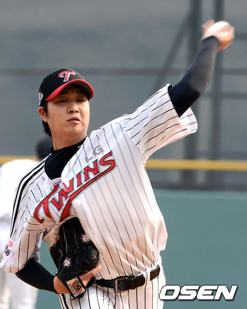 2일 오후 서울 잠실구장에서 열린 '2012 팔도 프로야구' LG 트윈스와 한화 이글스의 경기, LG 선발 이승우가 역투하고 있다.